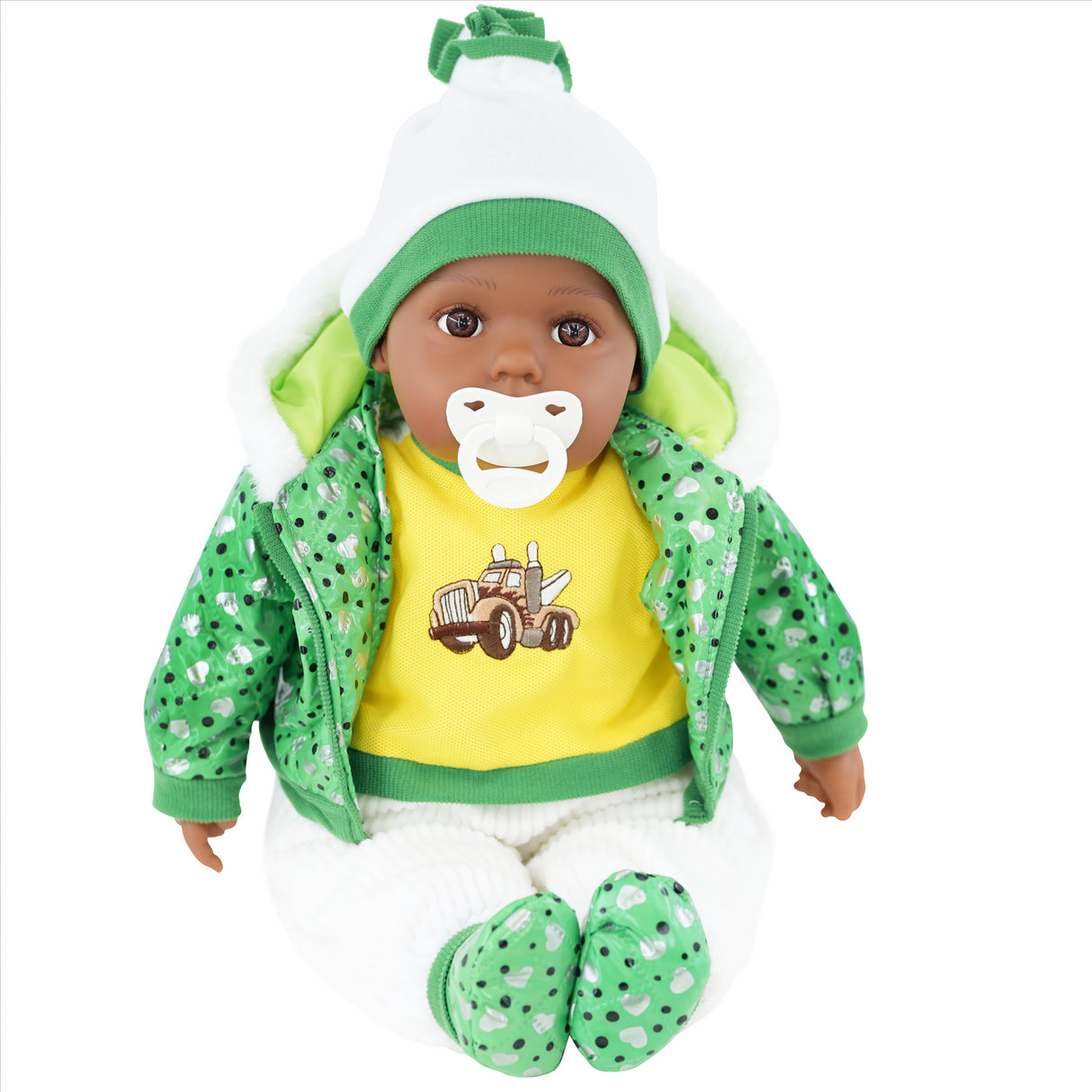 Dressed in a green and yellow outfit with fluffy hooded jacket, embroidered truck tee, knit pom-pom hat, and matching green booties. Detailed styling makes this black doll fun and unique.
