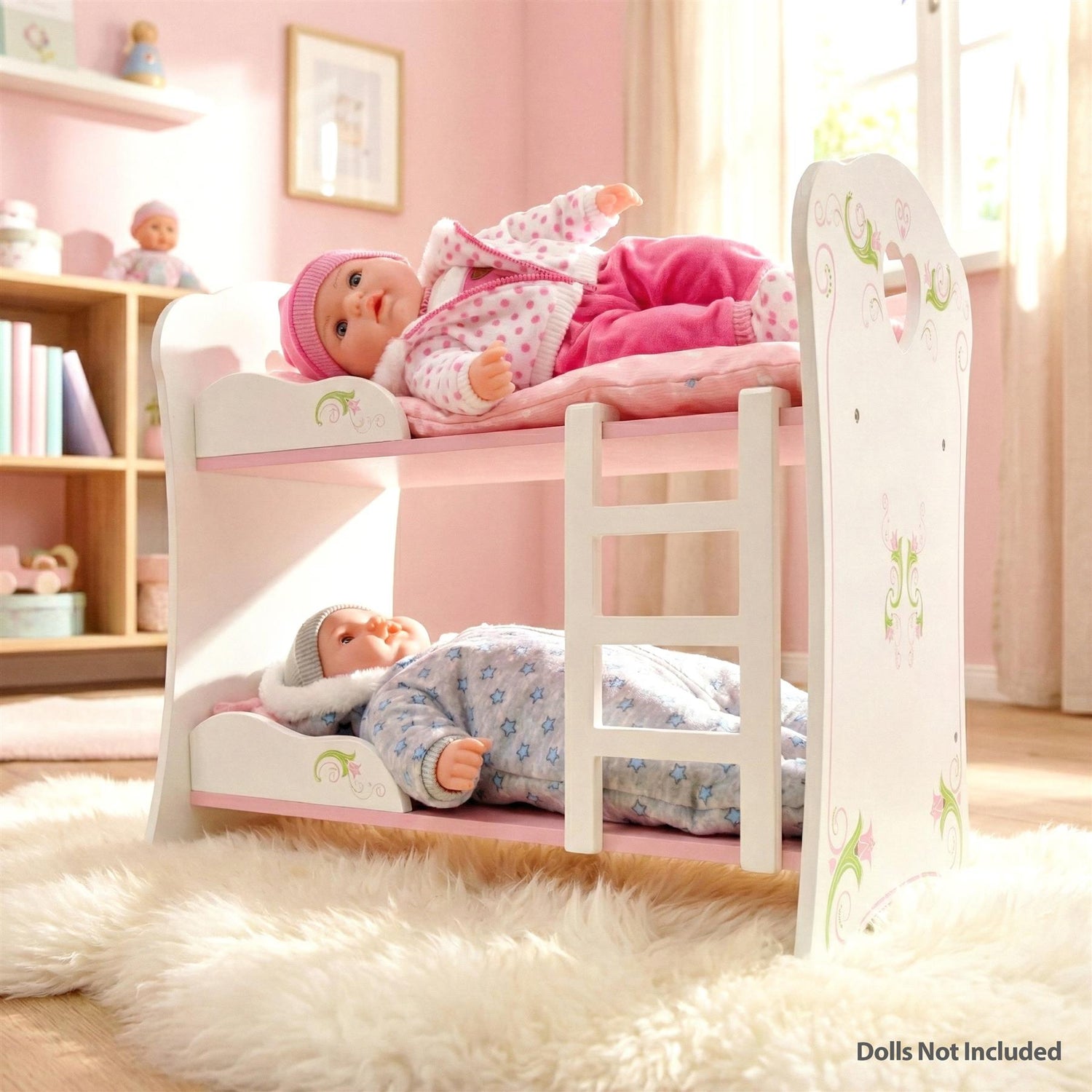Perfect for siblings or twin dolls. This sturdy wooden doll bunk bed features a classic white frame with pink floral details, allowing two dolls to sleep in style.