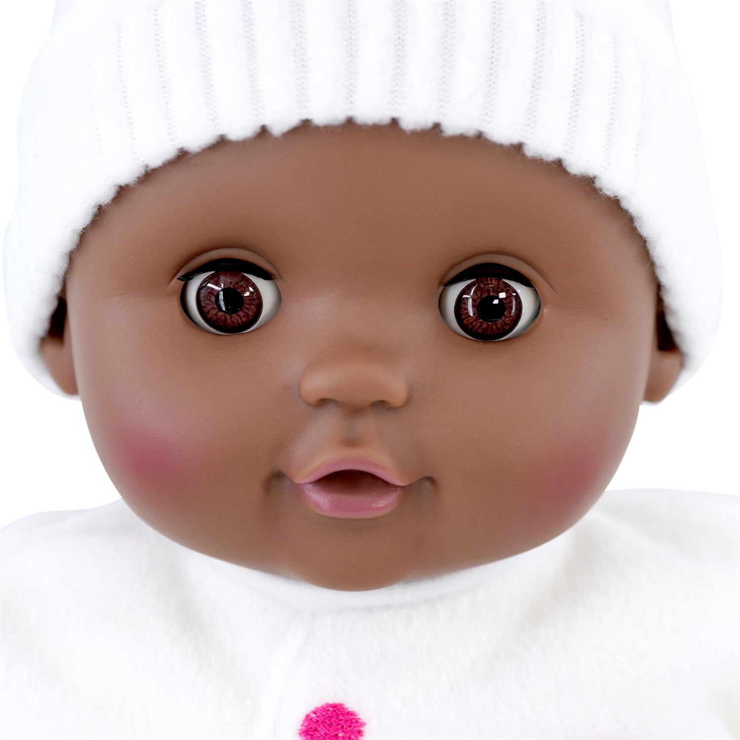 This 16" soft-bodied black boy doll has a lifelike appearance with dark skin and sleeping eyes that open and close. Perfect for toddlers to cuddle and cherish.