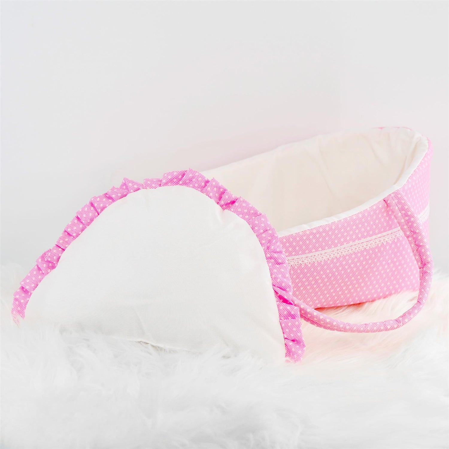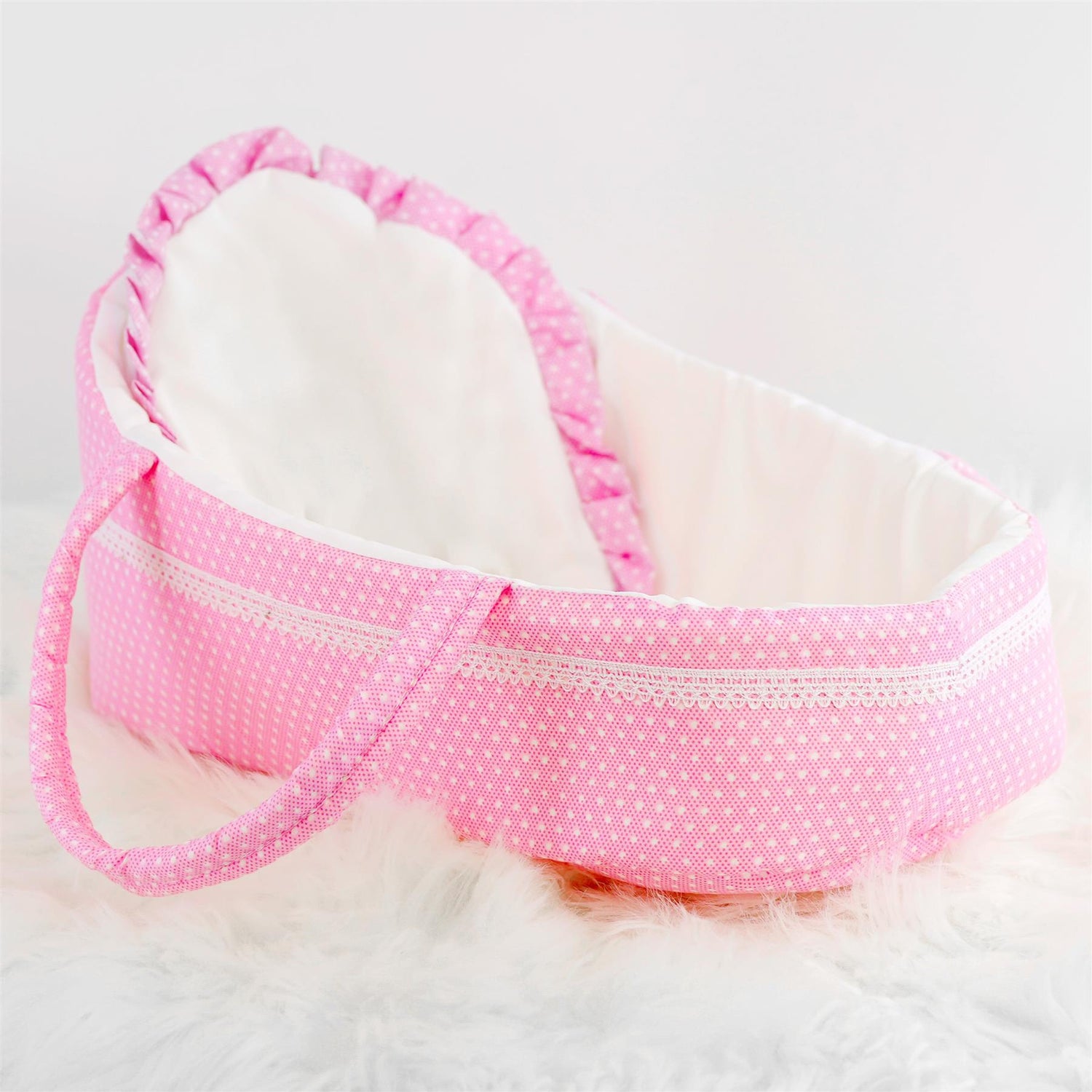 Give your child the gift of imaginative play with the BiBi Doll Carry Cot. This beautiful baby doll accessories piece is designed with soft pink fabric, charming lace trim, and a matching pillow. It is the perfect baby doll bed for toys up to 15 inches. Designed with sturdy handles, it is an ideal baby doll carrier for travel or visiting family. This dolls moses basket is a fantastic choice for any doll lover, including as an accessory for baby dolls.