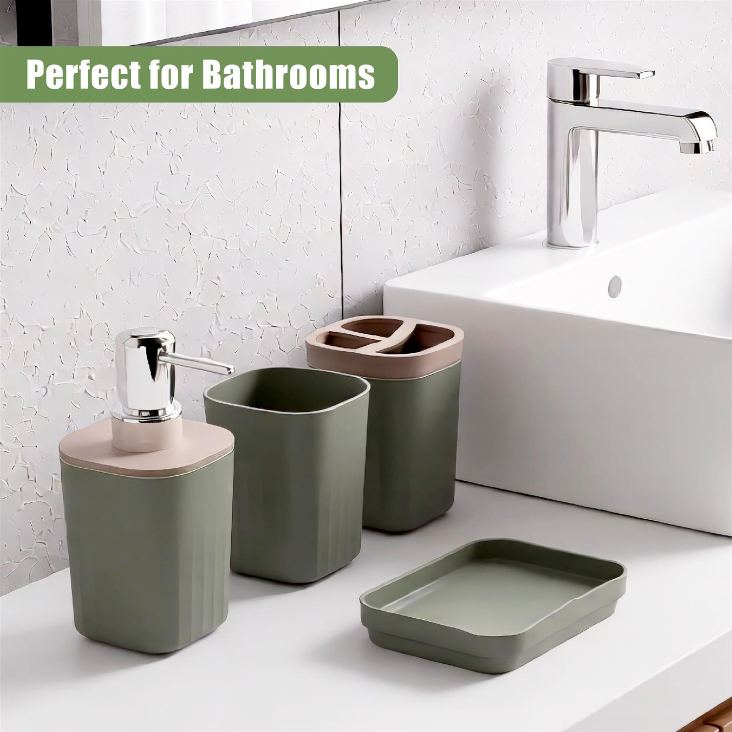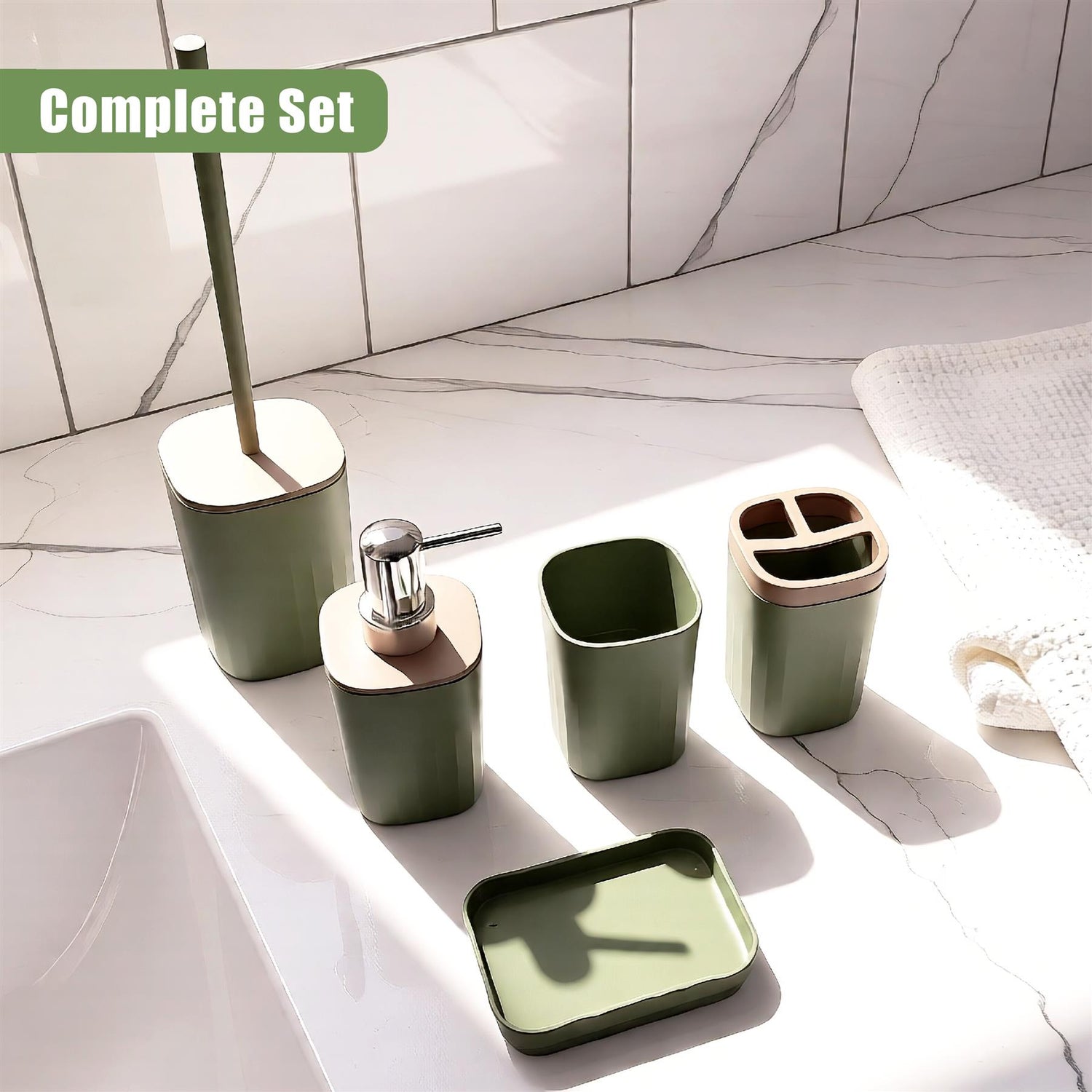 Upgrade instantly with the GEEZY 5 Piece Bathroom Accessories Set. This sleek sage green collection includes a soap dispenser, dish, toothbrush holder, cup, and toilet brush. It combines modern style with functionality to keep your sink and toilet area organized, hygienic, and beautifully uniform.