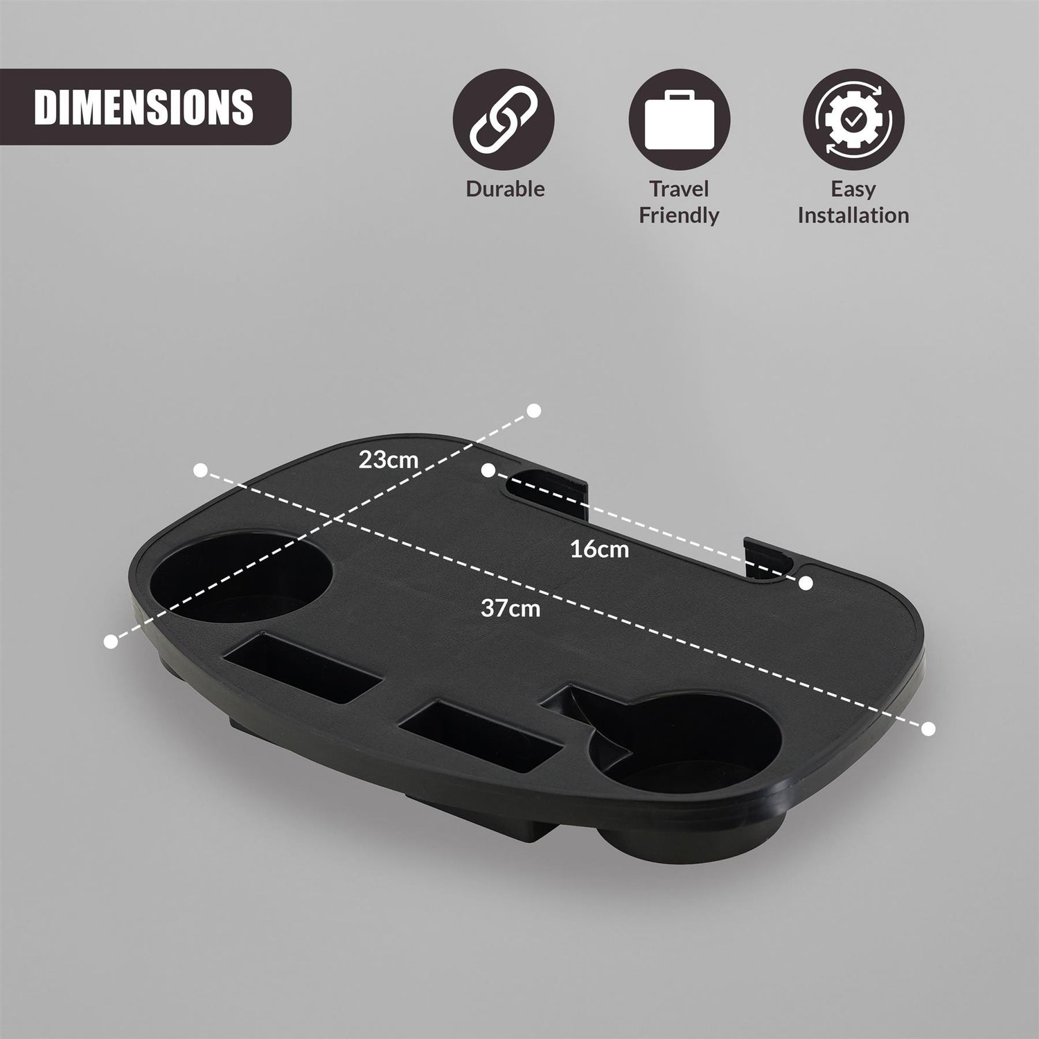 Sturdy, durable, and absolutely portable side table, ideal for camping, the beach and other outdoor activities. Slots for keeping your cell phone, mug, bottle and other things in place.