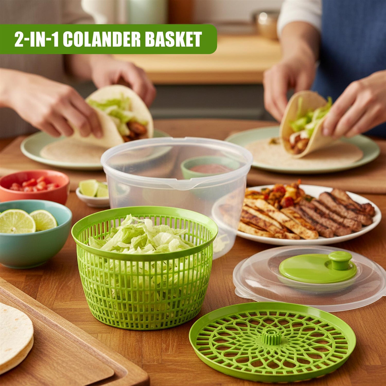 The inner slotted basket doubles as a standalone colander for rinsing salads, fruits and pasta, while the transparent outer plastic bowl can be used as a serving dish for your prepared salad.