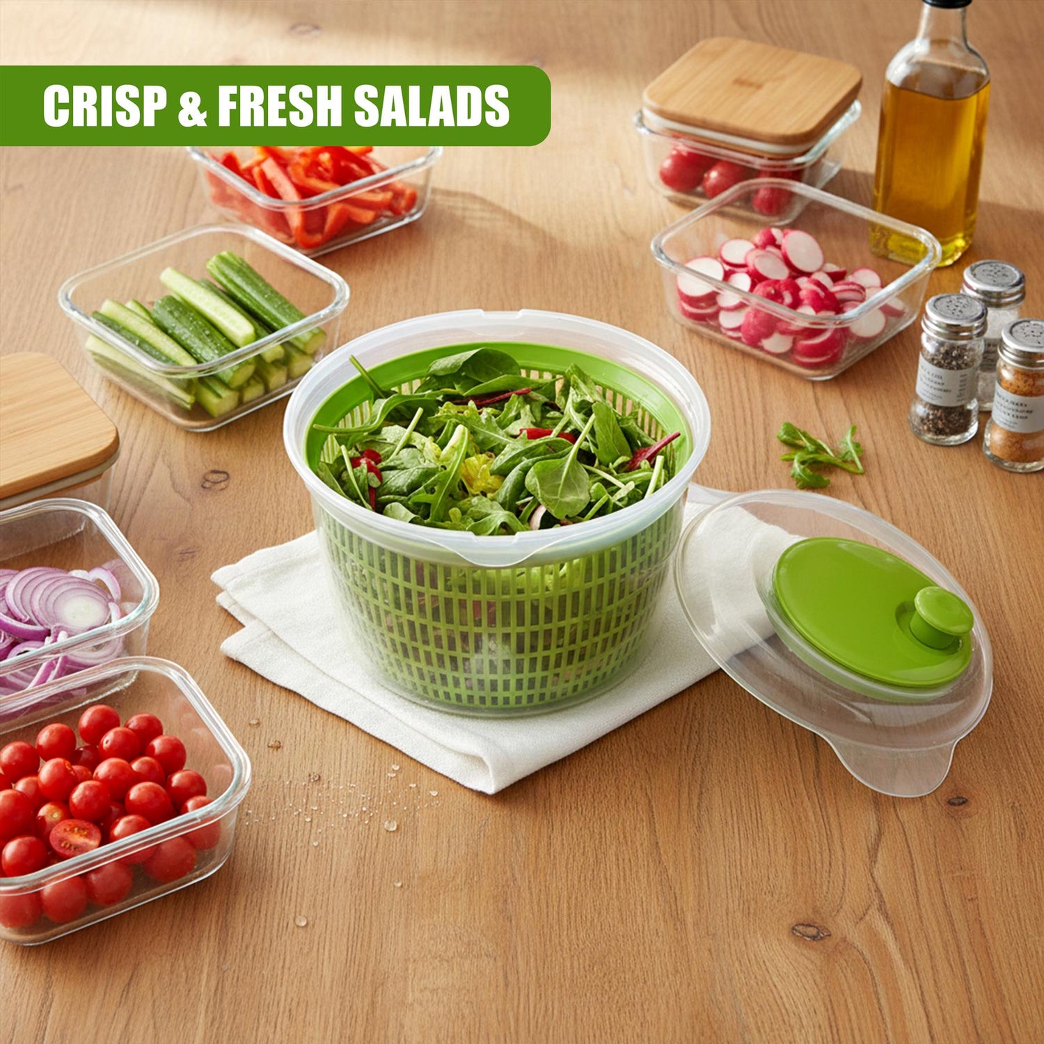 The lid features secure snap-lock clips to keep the unit firmly closed during operation. Once you are done, the entire lettuce spinner disassembles easily for thorough cleaning, making it a hygienic and practical addition to your kitchen tools.