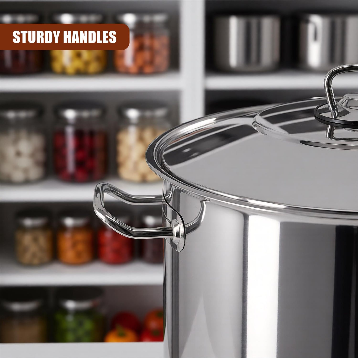 Ideal stainless steel stock pot with lid, perfect for stews, soups, currys, biryani, rice, pasta, and more, catering to big families or batch cooking.