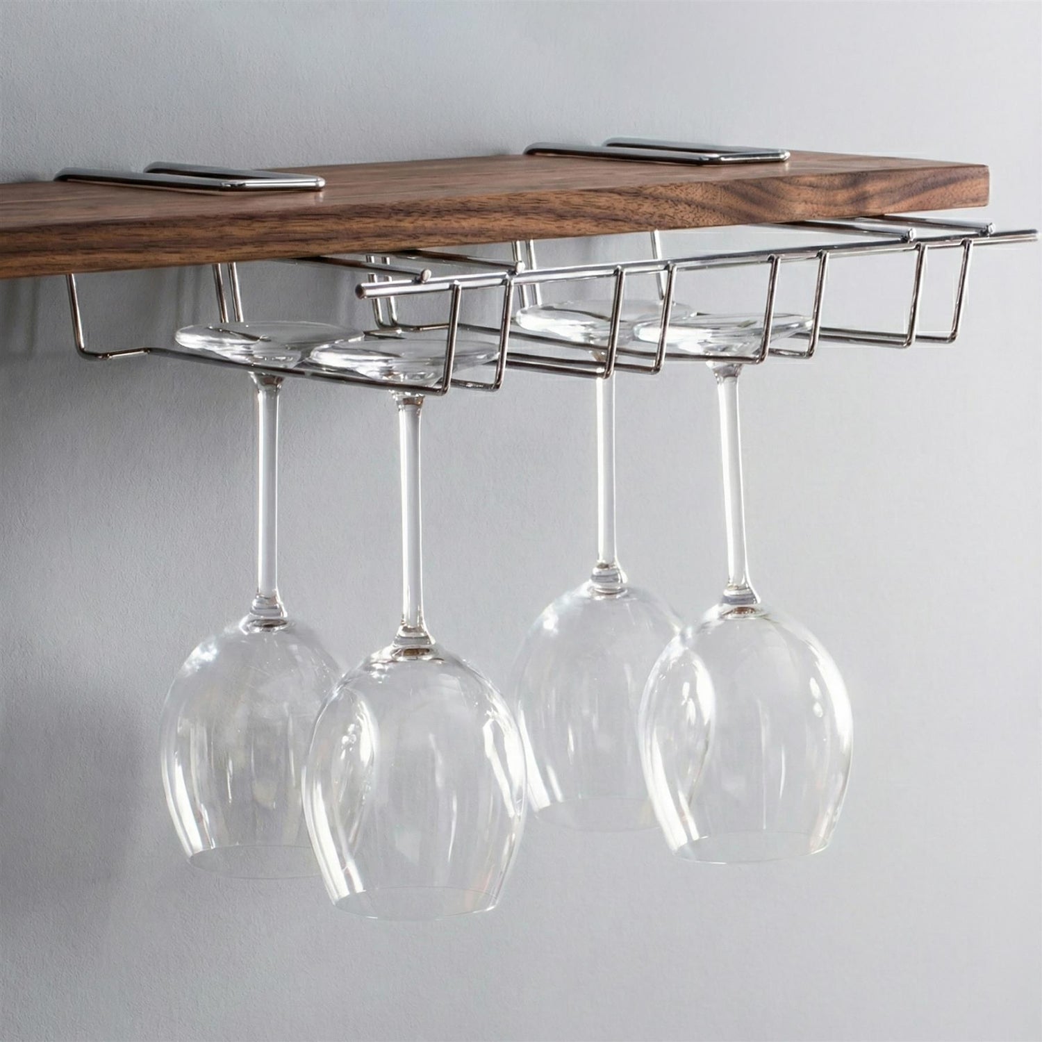 Free up valuable cupboard room. Mount under a shelf to display stemware, or inside a cabinet to conceal clutter. This wine glass rack under shelf creates instant storage for up to 12 glasses.