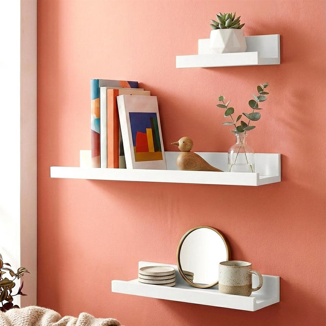 Create dynamic wall displays with this set of 3 shelves in different sizes. The varied lengths provide endless arrangement options. These white floating shelves for wall are perfect for any space.