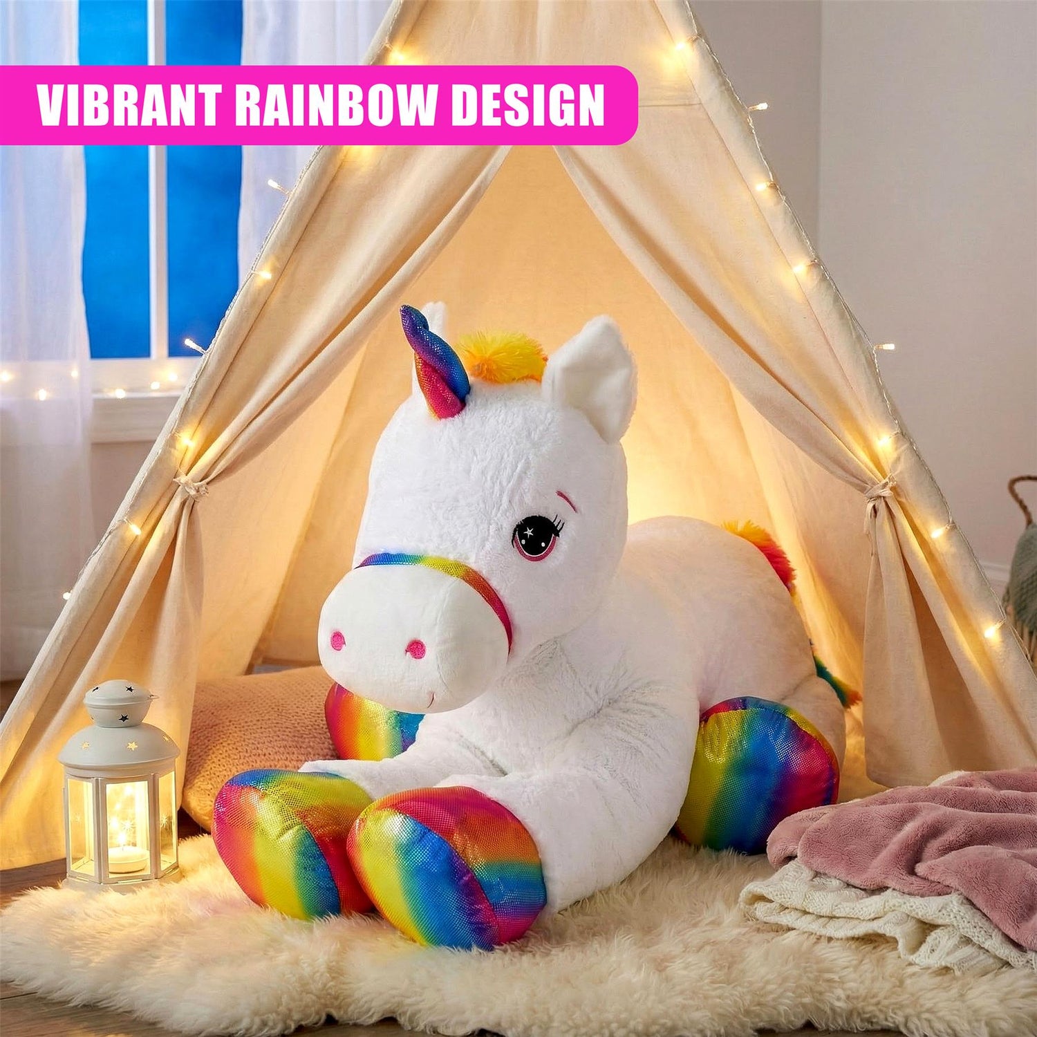 Features a shimmering rainbow horn, tail, and hooves that dazzle. This rainbow unicorn plushie transforms any nursery into a fantasy world, delighting fans of unicorn toys for girls and boys.