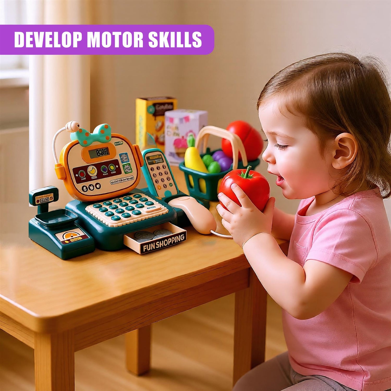 The Magic Toy Shop Cash Register is the perfect interactive children's till for imaginative play. This complete set allows kids to scan, weigh, and calculate prices just like in a real shop. The working calculator helps build early Maths skills, while the included play money and play food accessories enhance the fun. This set makes a great kids cash register and an essential centrepiece for all play shops for kids.
