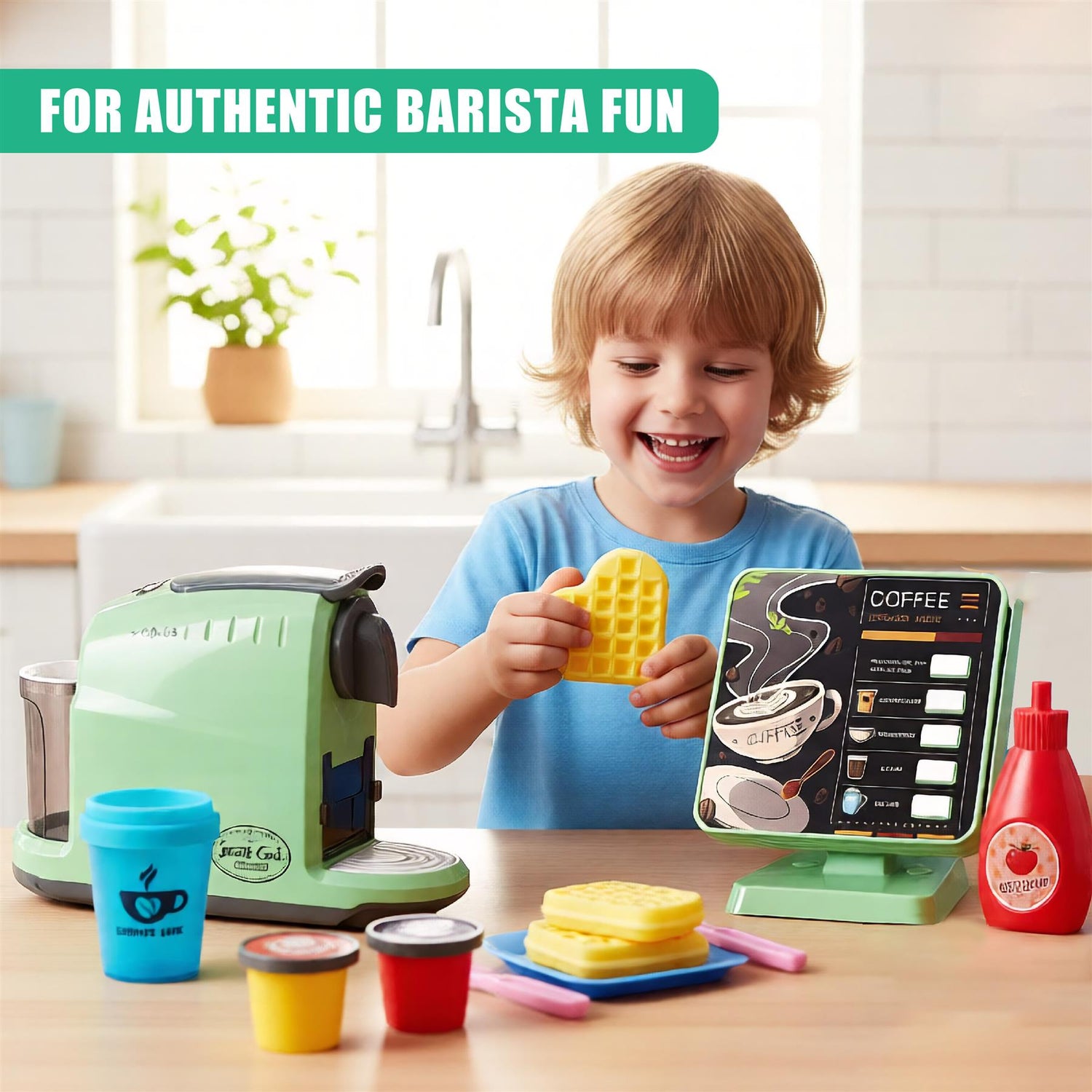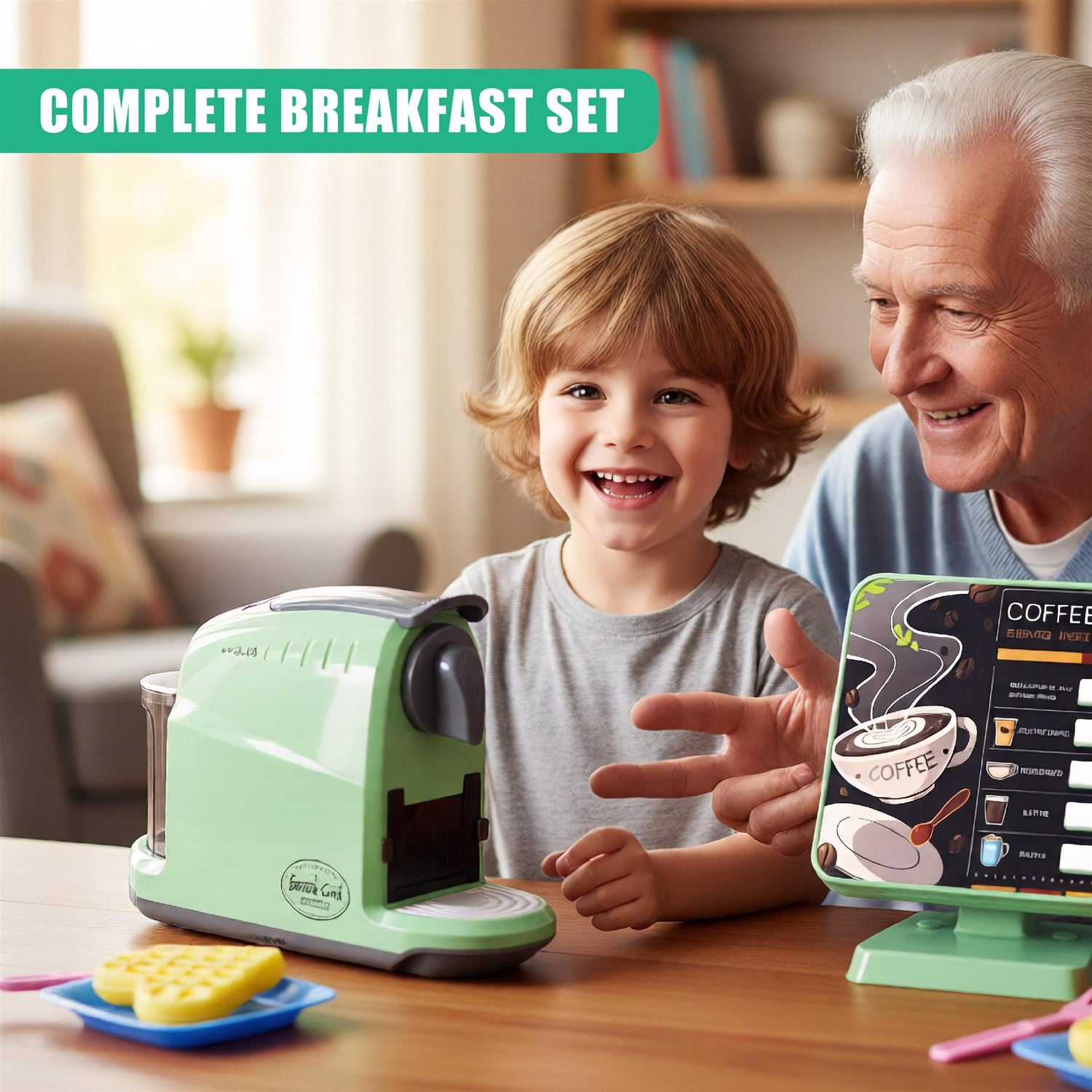Start your little one's day with The Magic Toy Shop Coffee Machine Playset. This interactive play coffee machine for kids features a working water dispenser and sound effects. Kids will love the 3-step process: pop in a capsule, fill the tank, and brew! The set includes a till screen, payment card, and waffles, making it a complete toddler coffee machine experience. It is the perfect addition to play shops for kids, allowing children to serve customers and develop social skills.