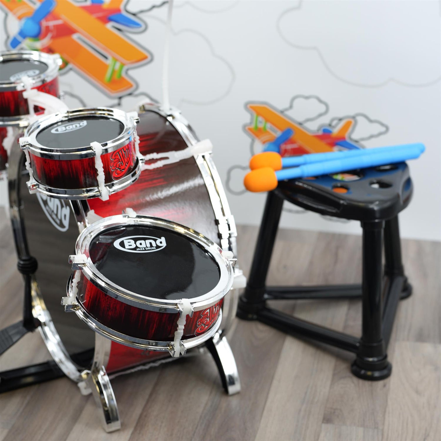 1 large bass drum with foot pedal, 2 medium drums, 2 small drums, 1 Pair of drumsticks, 1 Cymbal, 1 Stool.The kit is easy to assemble and will provide hours of fun for children.