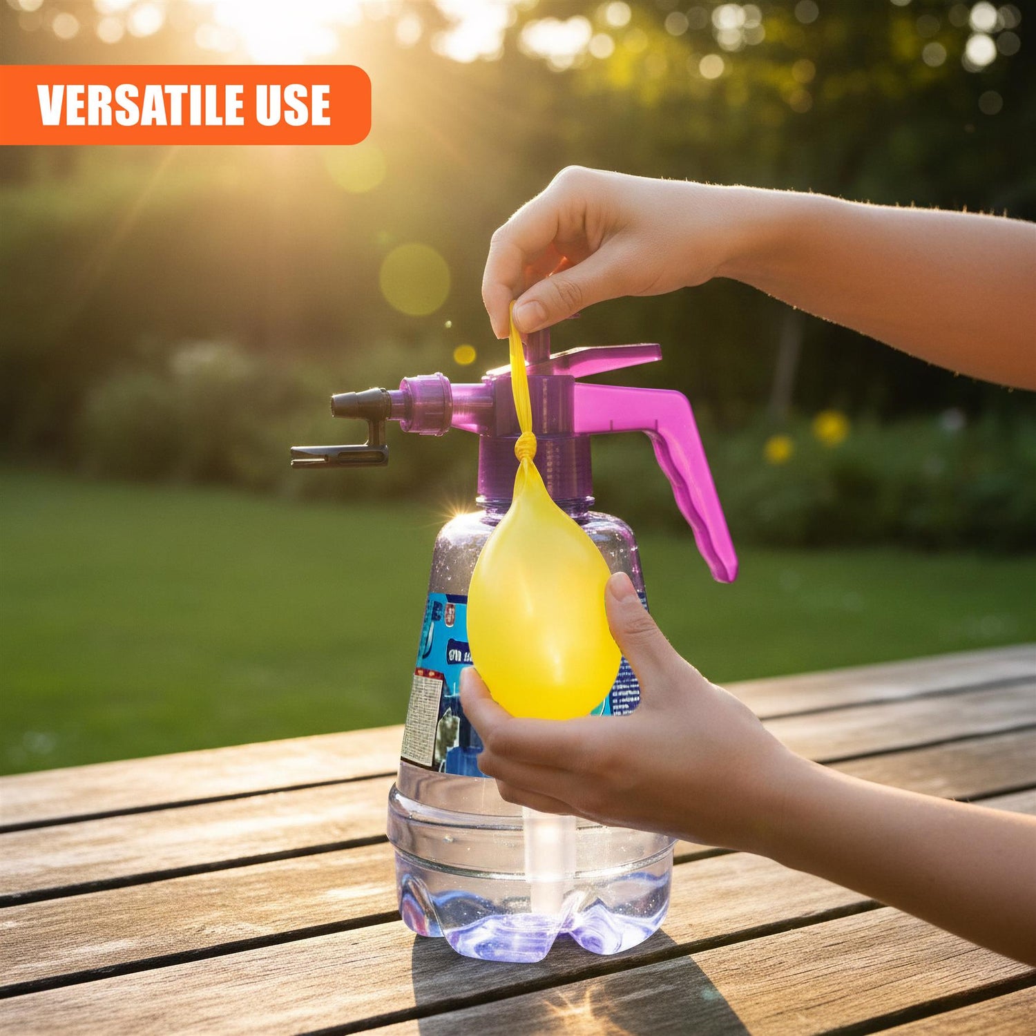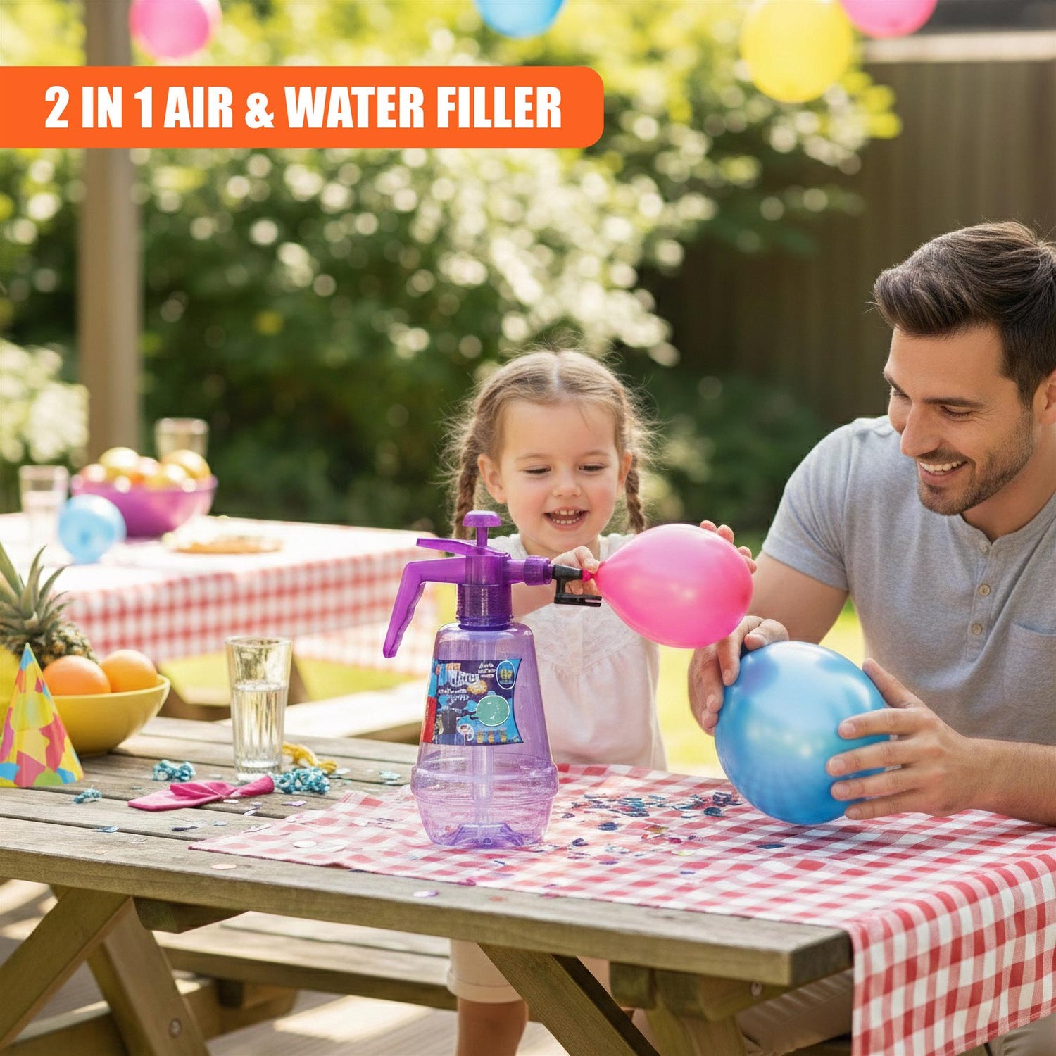 Prepare for the ultimate summer showdown with our 2-in-1 Balloon Pump. This ingenious water balloon pump doubles as an air filler, saving you the hassle of blowing up balloons manually. The set features a 1.7L reservoir bottle and includes 100 multi-coloured balloons to get you started immediately. Designed for ease of use, it features a pump-action handle and a clever knotting tool on the nozzle to tie off balloons in seconds. whether you are setting up for a birthday party or engaging in a chaotic water fight, this pump for balloons is the essential garden party accessory.
