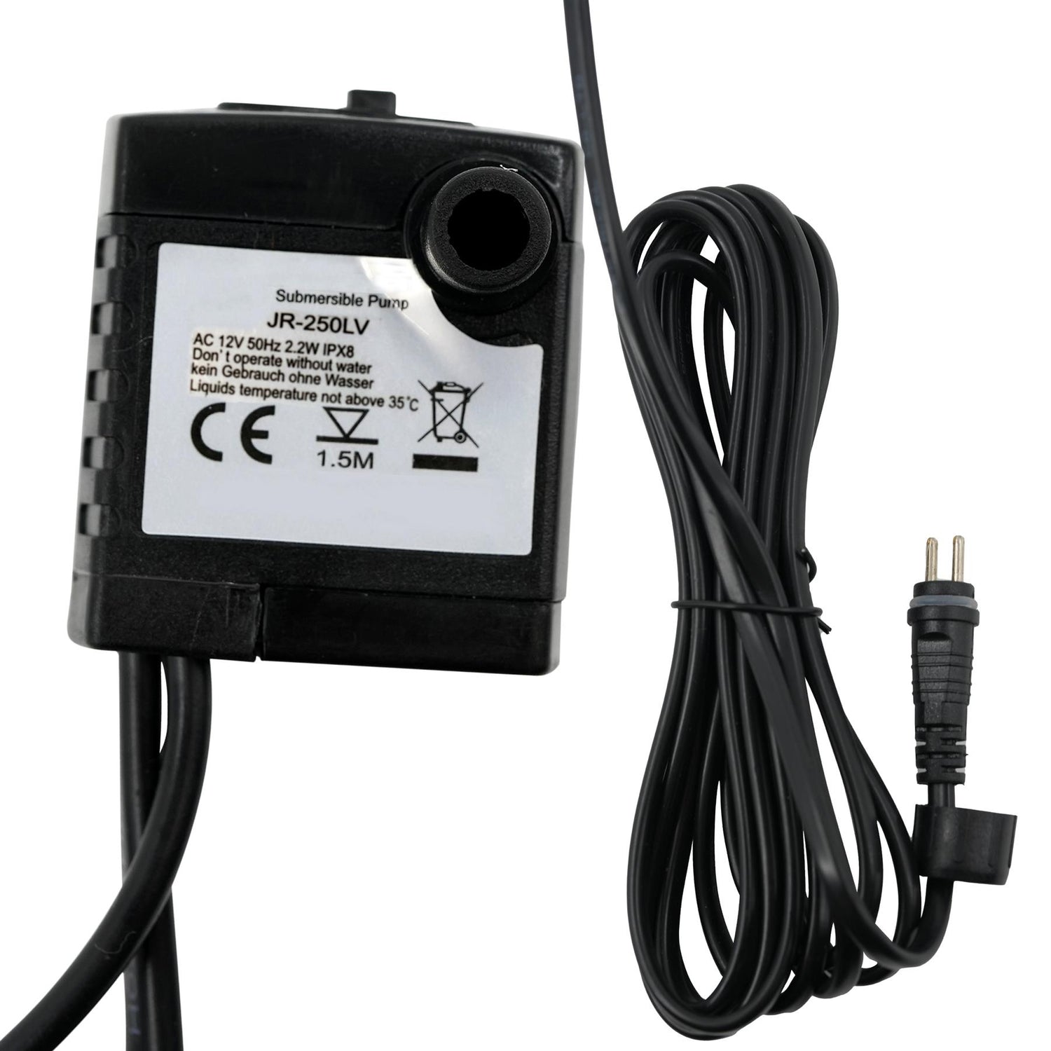 With an adjustable slide button to control the water pressure. This submersible water feature pump is providing the different water flows you desire. No nozzle included, this is a replacement pump for OUTDOOR GEEZY FOUNTAINS so only the pump is included.Quiet Operation: