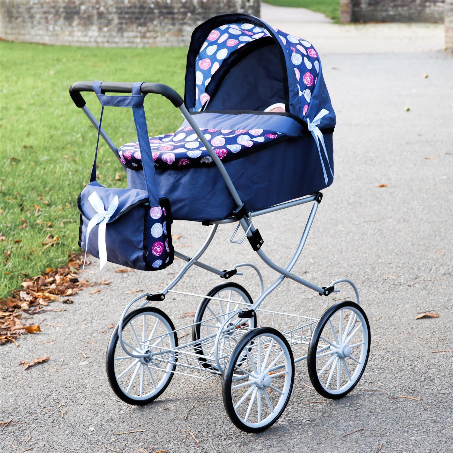 Treat older children to elegant pretend play with this classic Cambridge baby doll pram. Specifically designed with a taller handle, it is perfectly suited for growing kids from 3 to 10 years old. The beautiful blue pushchair features large vintage style wheels, an adjustable sun canopy, and a fully removable carry cot. A matching changing bag and spacious bottom basket provide ample room for essential accessories. It makes a truly wonderful gift for children who love immersive caretaking games.