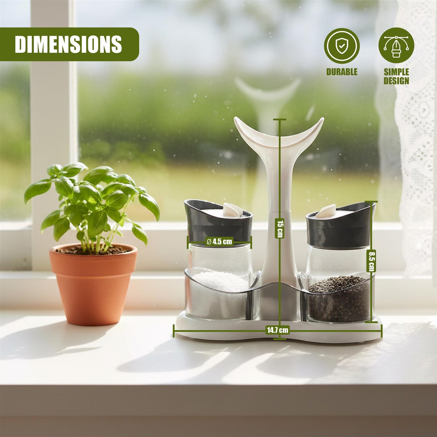 SPECIFICATIONS: Item Dimensions: Width: 14.7 cm, Depth: 7 cm, Height: 15 cm / Weight: 290 g / Package Dimensions: Height: 7.5 cm, Width: 15 cm, Depth: 15 cm / Package Weight: 290 g / Material: Glass, Plastic / Color: White / Dimension of Shakers: Diameter 4.5 cm, Height 8.5 cm