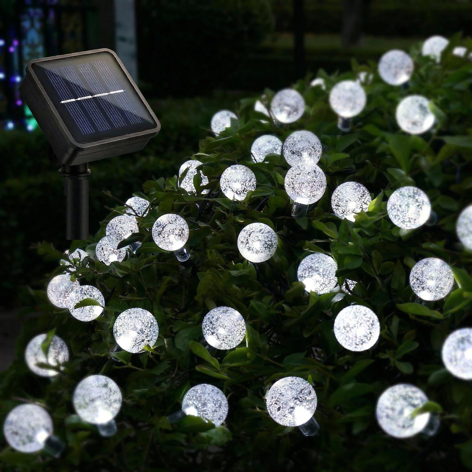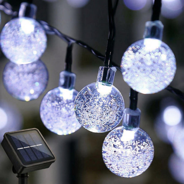 Brighten your outdoor space effortlessly with these beautiful solar powered crystal ball lights. Featuring 30 bright white LEDs on an 8 metre wire, they automatically charge by day and illuminate from dusk to dawn. Choose from 8 different light sequences to create a magical atmosphere for any occasion. The highly durable, water resistant design ensures they withstand heavy rain and winter snow perfectly. They are the ideal decorative accessory for your patio, yard, or festival parties.